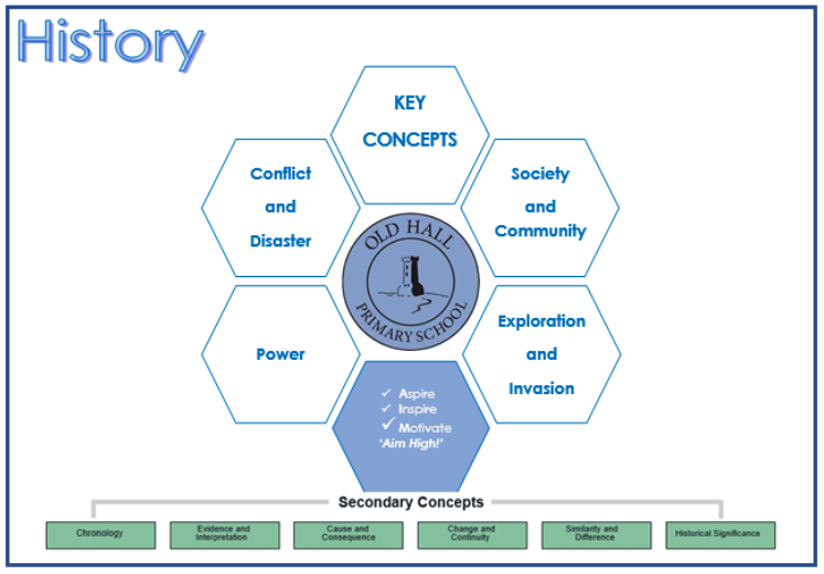 At Old Hall Primary School, we are historians! We want our children to love history. We want them to have no limits to what their ambitions are and grow up wanting to be archivists, museum curators, archaeologists or research analysts. We all embrace the school motto of: 'Aspire, Inspire, Motivate - Aim High!’ – this is both spiritually and academically.